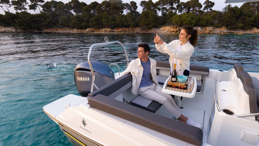 The Cap Camarat 7.5 CC can accommodate up to eight people for outings, where all the on water activities are wide-open: fishing, water skiing, day trips, sunbathing, diving, swim-ming… While cruising, passengers can sit on the bench seating, forward of the helm station and facing the water, or choose the U-shaped cockpit for a cosier ride. Movement is fluid around the console between these two entertainment areas while cruising, but also at anchor, when the folding bench seating facilitates opens up the cockpit, giving access to the large storage lockers, and swim platforms.