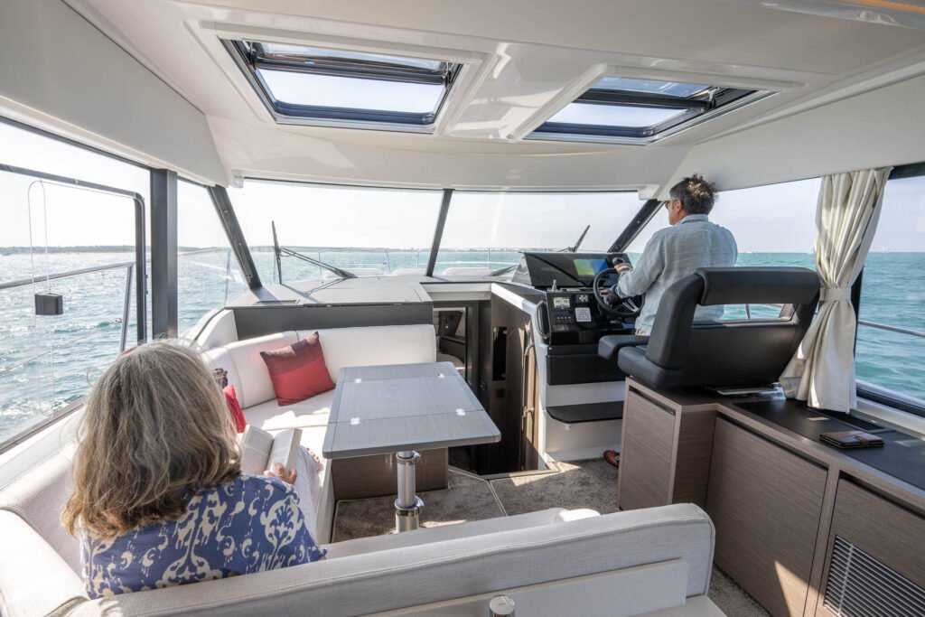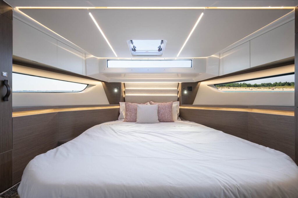 A true appartement on the water, the flagship of the line offers a bright, magnificent living space, from the wheelhouse to the cockpit, with a 360° view of the sea and two opening sunroofs. The U-shaped galley, connecting interior and exterior spaces, becomes a gathering place while facilitating passage. The warm, inviting saloon benefits from seating designed with rounded edges, armrests, and leather handrails, enabling everyone to be comfortably seated around an extending table with two leaves.